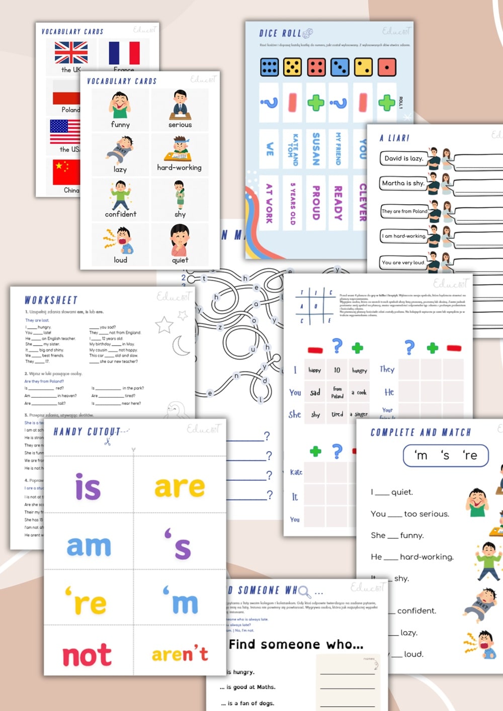 Zapomnij o nudnych ćwiczeniach na czasownik „to be”! Ten 33-stronicowy ebook w formie PDF dla nauczycieli angielskiego to prawdziwa kopalnia kreatywnych gier, angażujących ćwiczeń i wszechstronnych kart pracy dla uczniów klas 4-6. W zestawie znajdziesz m.in. grę planszową z kartami, quizy, elementy do budowania zdań, układanki, klasyczne karty pracy, flashcards, gry językowe i wiele więcej. Zaangażuj uczniów jak nigdy dotąd i oszczędź cenne godziny przygotowań dzięki gotowym, pięknie zilustrowanym materiałom.