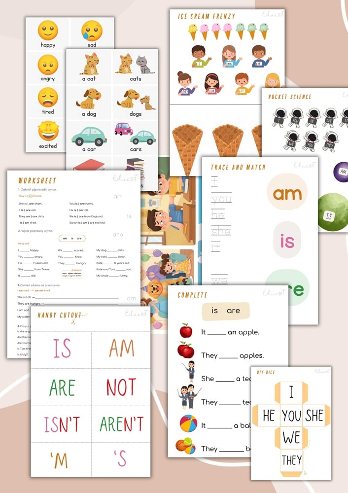 Zapomnij o nudnych ćwiczeniach na czasownik „to be”! Ten 30-stronicowy ebook w formie pdf dla nauczycieli angielskiego to prawdziwa kopalnia kreatywnych gier, zabaw manualnych i angażujących kart pracy dla uczniów klas 1-3. W zestawie znajdziesz m.in. klasyczne karty pracy, gry memory, kostki DIY, wycinanki, karty obrazkowe i wiele więcej. Zaangażuj uczniów jak nigdy dotąd i oszczędź cenne godziny przygotowań dzięki gotowym, pięknie zilustrowanym materiałom.