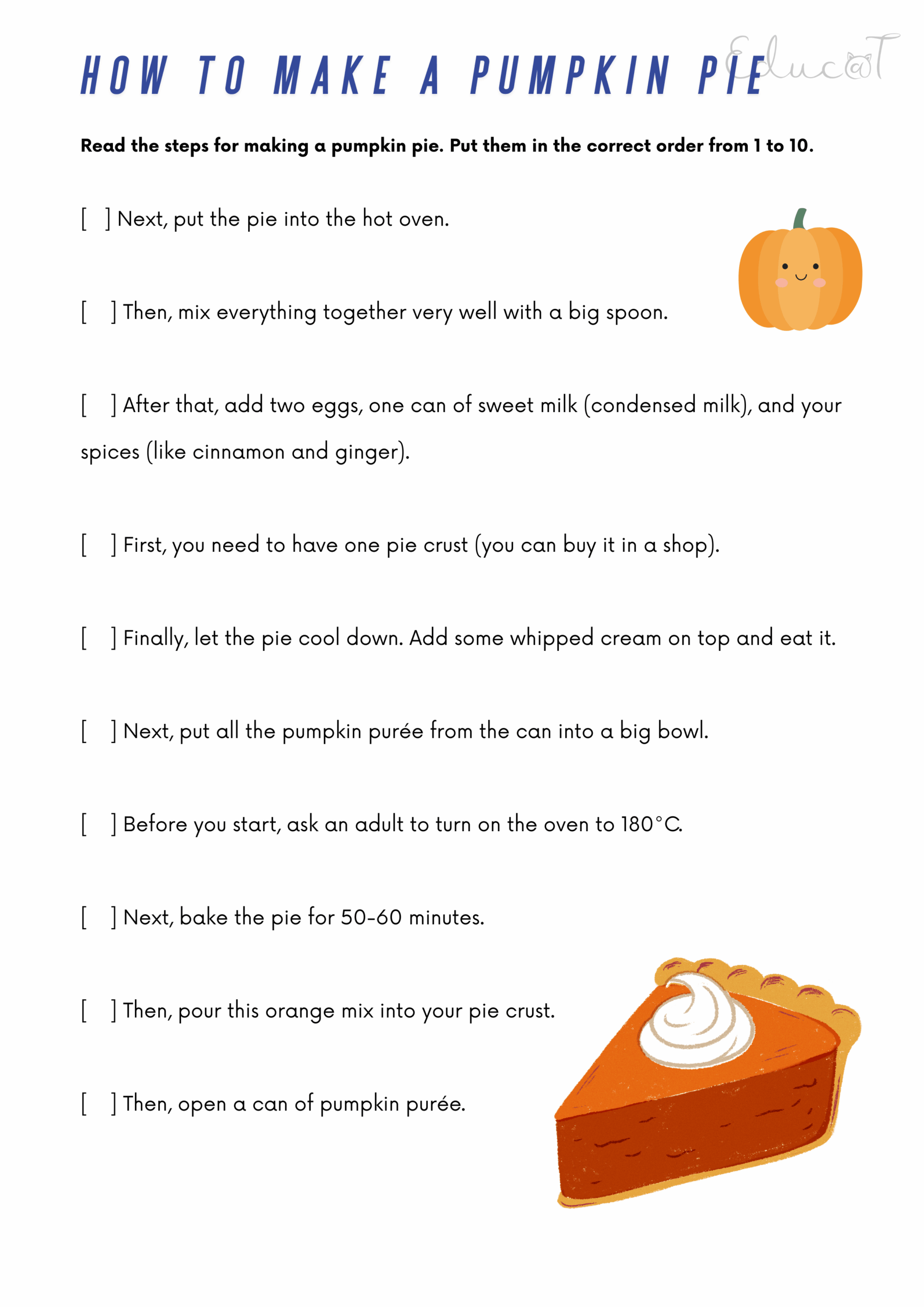 - How to Make a Pumpkin Pie: Ćwiczenie na logiczne myślenie i czytanie. Uczniowie muszą ułożyć 10 kroków przepisu w poprawnej kolejności;