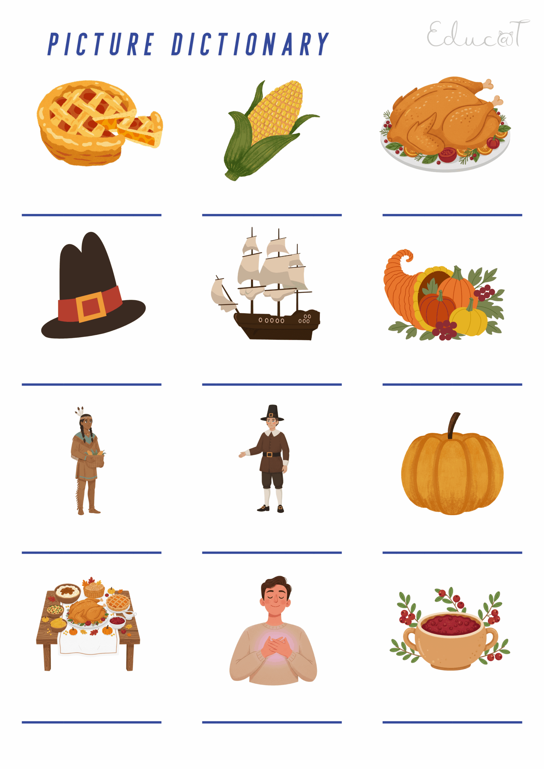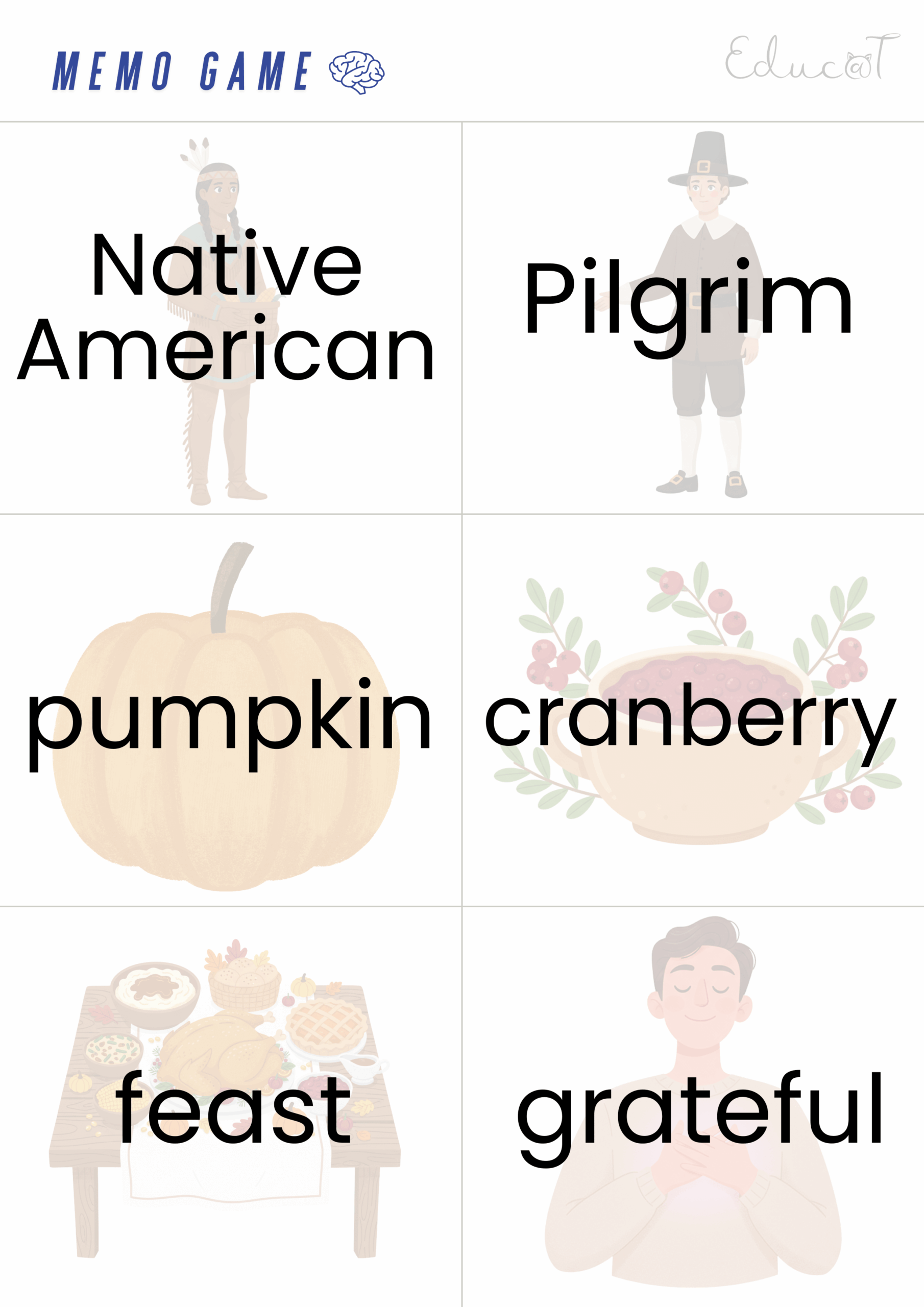 🌽Słownictwo i Gry: Pakiet wprowadza i utrwala 12 kluczowych słów (m.in. Pilgrim, Mayflower, feast, grateful, cornucopia). Utrwalenie odbywa się poprzez: