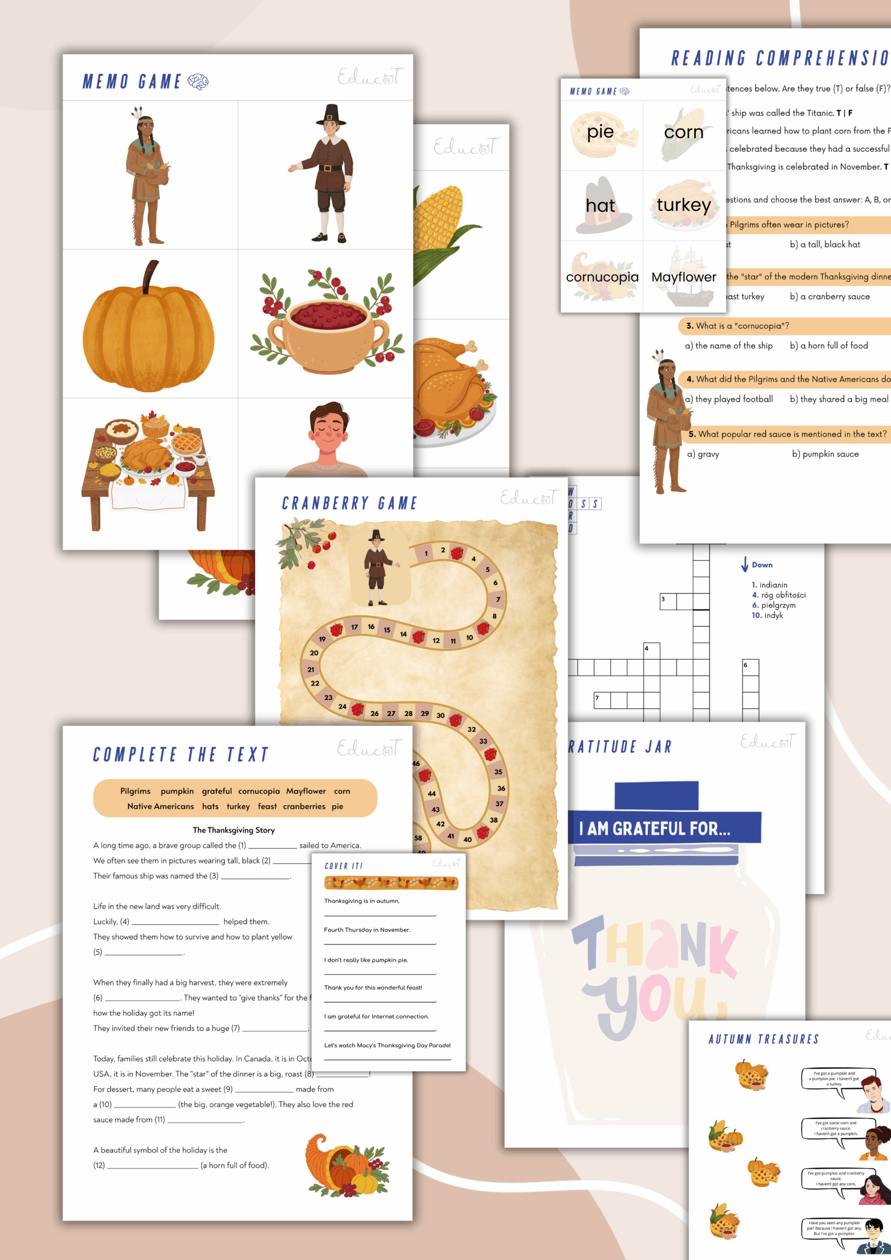 Kompletny zestaw materiałów o Święcie Dziękczynienia na lekcje angielskiego. Pakiet łączy wiedzę kulturową z praktycznymi ćwiczeniami językowymi.