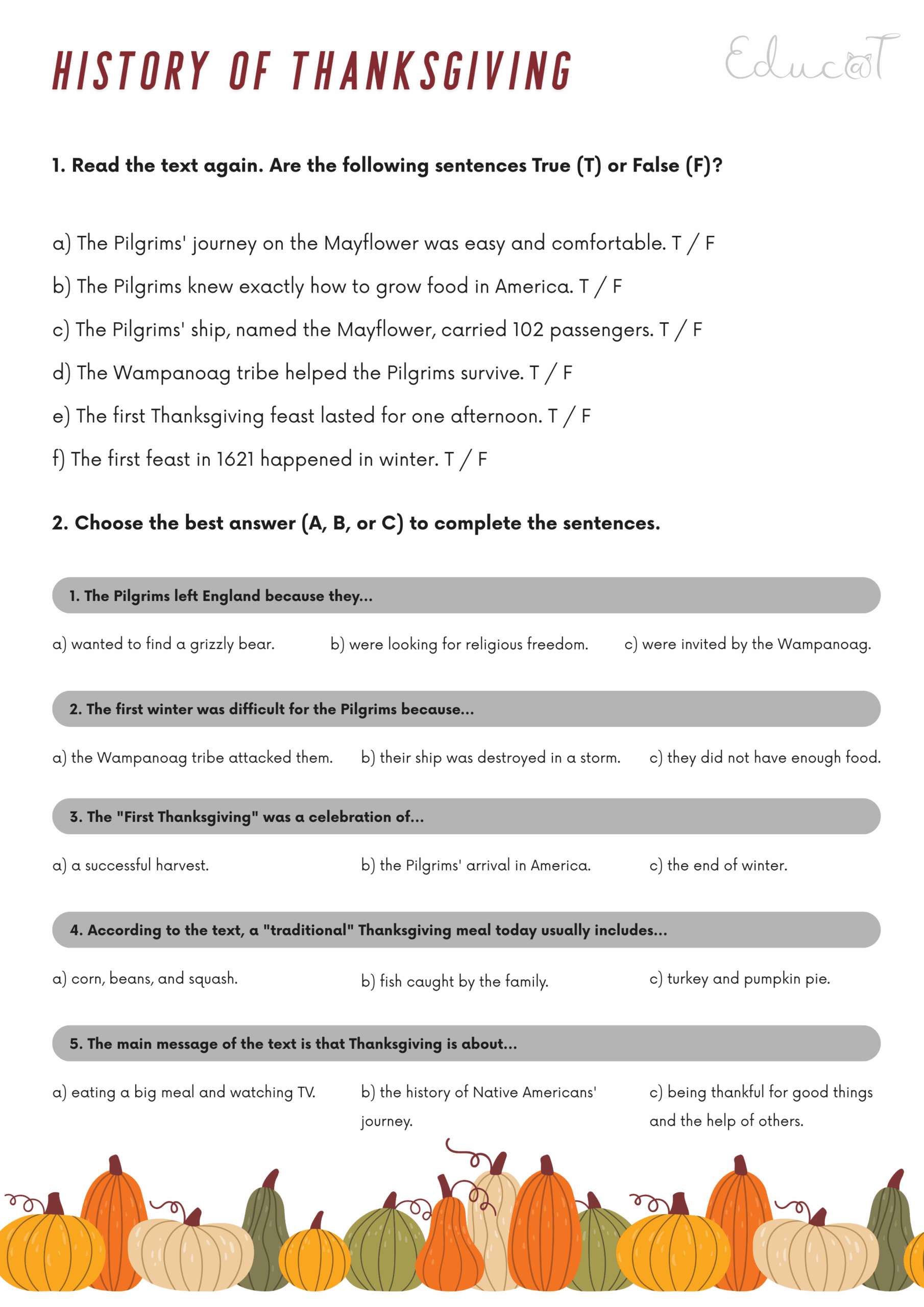 • Angażujący tekst „History of Thanksgiving” (+ zadania na zrozumienie tekstu: T/F i ABC).